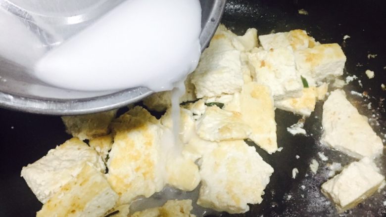 2. 锅中放油,嫩豆腐切成薄片下锅,小火慢煎