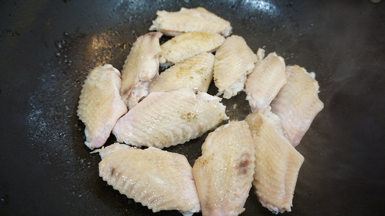 8. 再放入鸡翅不断翻炒,加少许的白糖,提鲜