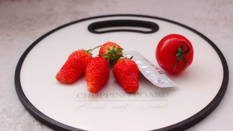 9. 切好的草莓块和番茄块放入果汁杯中。
