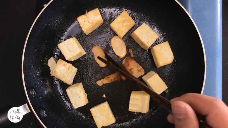 4. 热锅下油,把豆腐和醒开的(牛佤)冻干松茸菌,煎至金黄色。