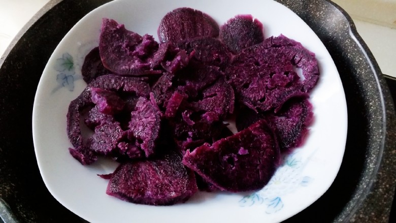 2. 锅里倒入水,将紫薯放入锅里蒸熟。