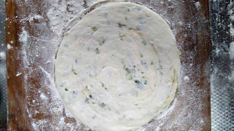 3. 面擀成长方形的薄片,刷一层鸡油,撒上盐、十三香、花椒粉、葱花