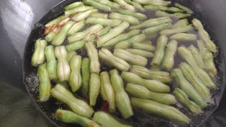 8. 放入芸豆后不要着急加水,先用铲子不停地翻炒芸豆,直到把芸豆炒的有点软有点蔫的样子。