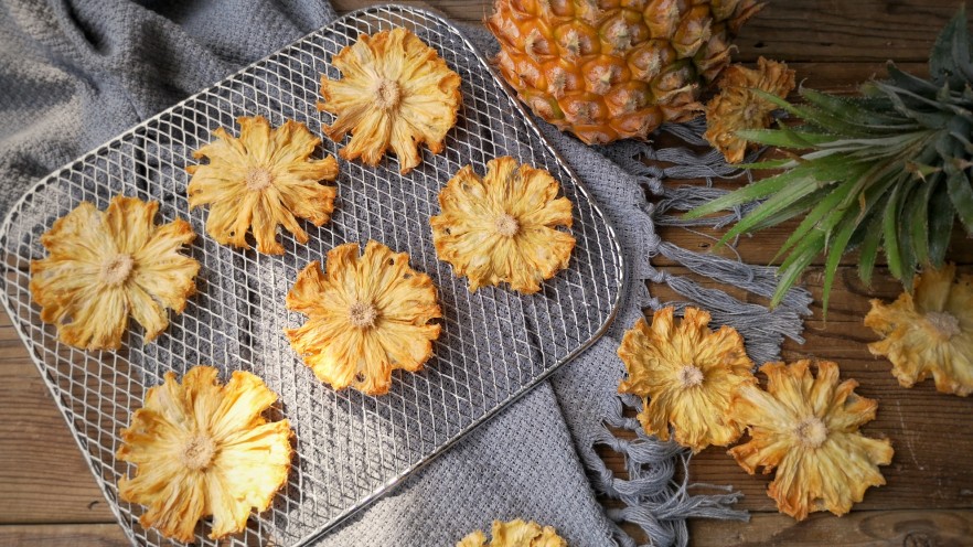 - 自制菠萝干为非油炸型,保留菠萝鲜果原有的新鲜、美味、芳香与营养。其独特的柔韧口感绝对让您回味无穷。菠萝干口感酸酸甜甜,有一点软软的,香而不浊,甜而不腻,非常耐嚼,回味无穷。夏天经常会因为太热而吃不下东西,吃点菠萝干还能开胃助消化!美味的菠萝对身体健康有着不同的功效。