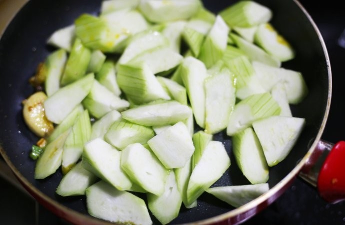 6. 热锅凉油,油热后放入葱段和蒜煸炒出香味,把丝瓜放入锅中翻炒至变色,往锅中倒入清水没过丝瓜烧开。