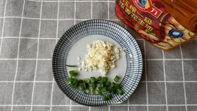 6. 蒜切末,小葱切圈备用。