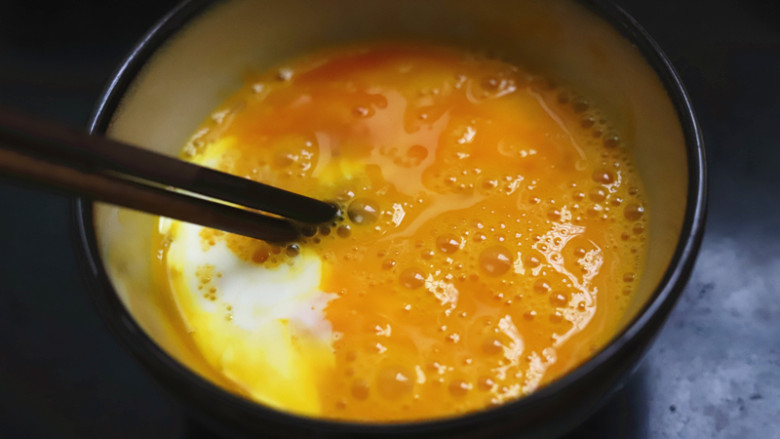 3. 鸡蛋中加入盐和糖,用筷子搅匀,尽量把蛋液搅得看不到蛋白。