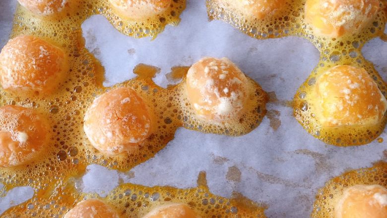 3. 烤盘垫油纸,把蛋黄放在上面,烤箱预热180度