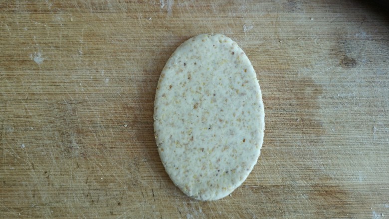 7. 将面剂子按扁,擀成牛舌状。(不要擀的太薄)