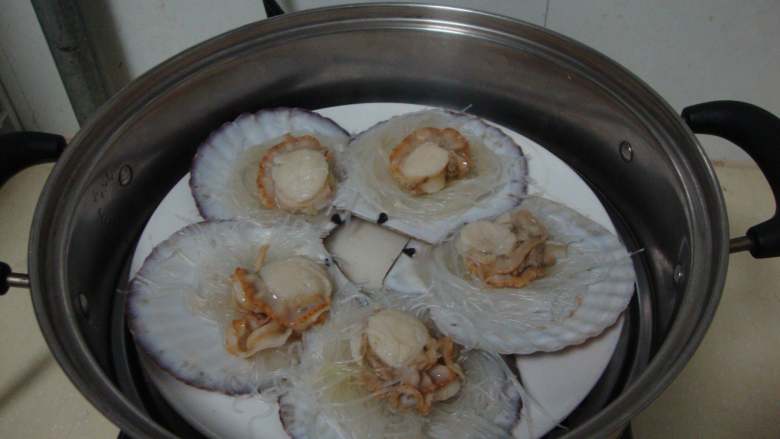 3. 粉丝揪一些放入壳中,放上扇贝肉