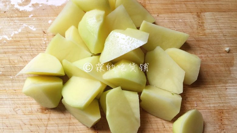 2. 土豆切成合适大小的块状,蒜剁成末、小葱切成葱花(把葱白和葱叶分开)。