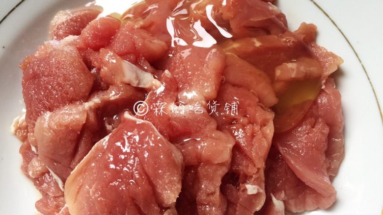 3. 里脊片成一寸见方,稍厚点的片,然后开十字花刀。