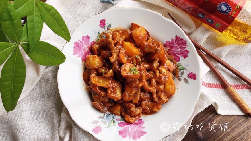 13. 最后把炸好的肉片和土豆倒入,翻炒均匀,让酱汁充分包裹住肉片和土豆。
