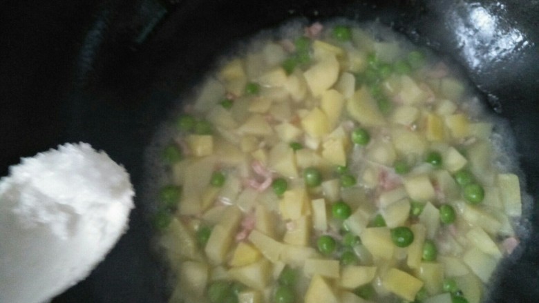7. 放入土豆,青豆,培根,适量的水,盐将土豆煮软收干水。