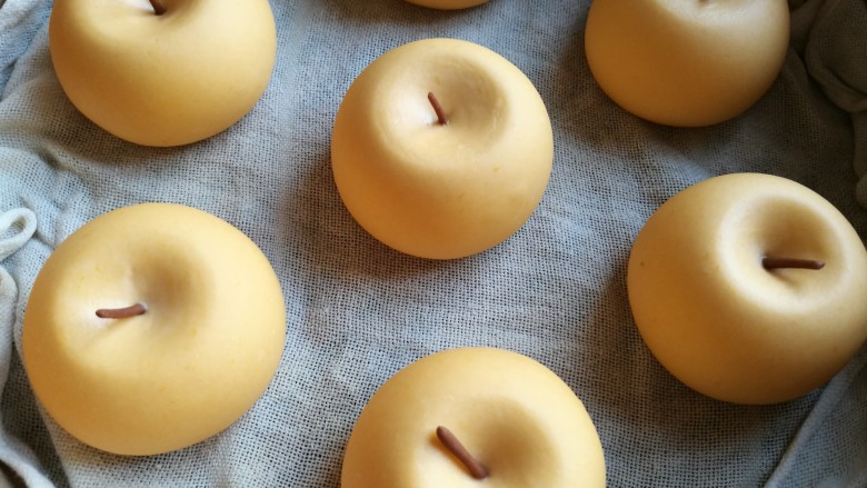 10. 在凹下的中间挨个按上苹果把,金黄色的小苹果做好了。 山东有一种吃起来口感面面的,名字叫金帅苹果,就是这个样子。
