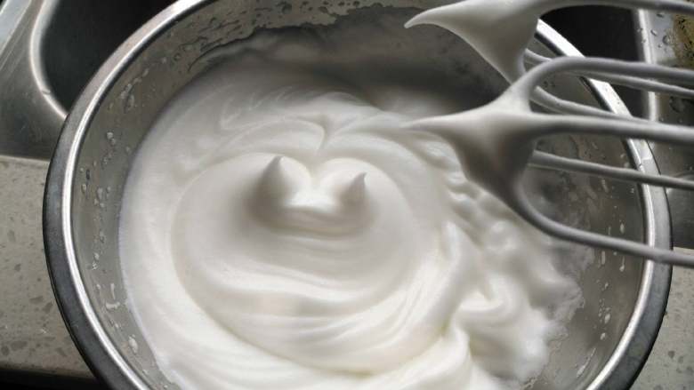7. 蛋清加入少许柠檬汁,分3次加入40克白糖,打发至湿性发泡