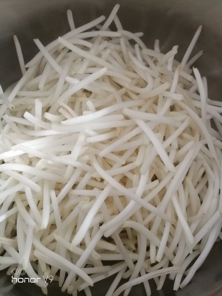 16. 放入炒好的牛肉和豆芽,炒均匀,关火,出锅