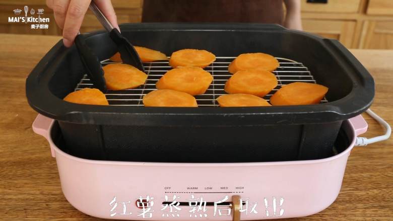 1. 红薯使用蒸锅蒸熟取出,压成泥。