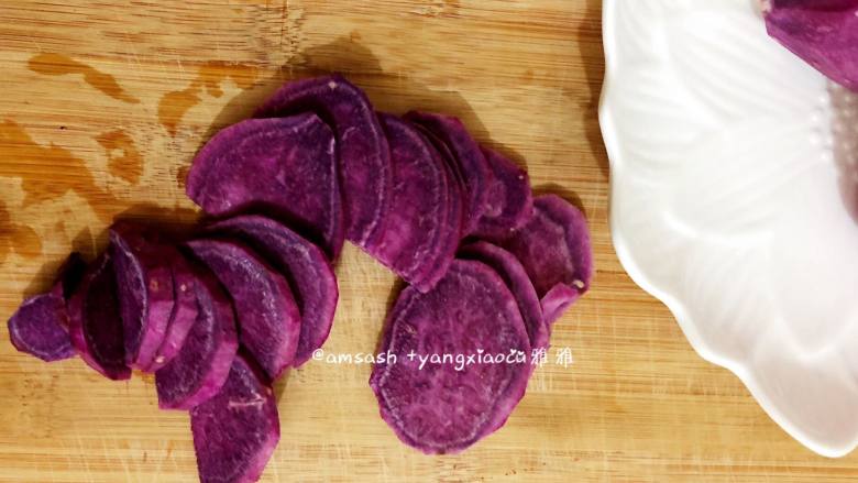 2. 紫薯洗干净,刨去外皮,切成薄片,切片切记别切太厚了,这样蒸的时候才容易蒸熟