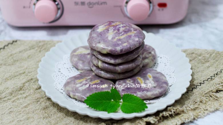 10. 依次做好所有的饼,把紫薯饼放在煎盘中 煎至两面金黄即可