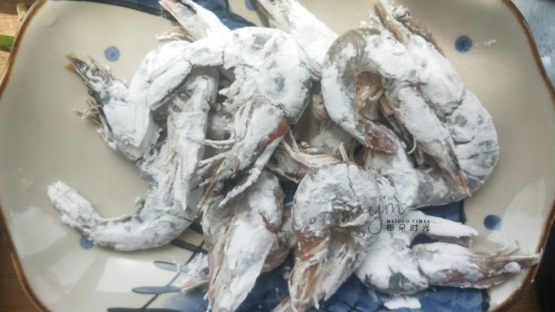 5. 腌制好的虾挨个取出用厨房纸擦干净水分,然后放玉米淀粉里滚一滚,让它全身粘上干淀粉。