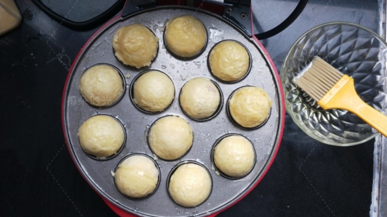 15. 丸子烤盘里的每个小坑里放一点油。用刷子刷就可以。