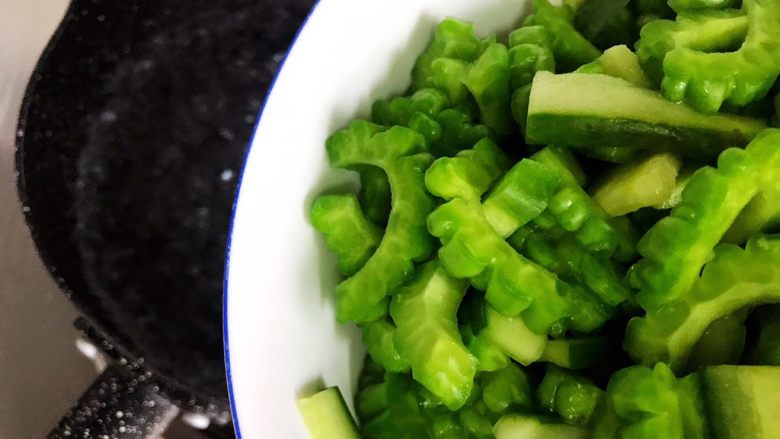 4. 苦瓜洗净切去头尾,对半切开,用勺子挖去籽和白瓤