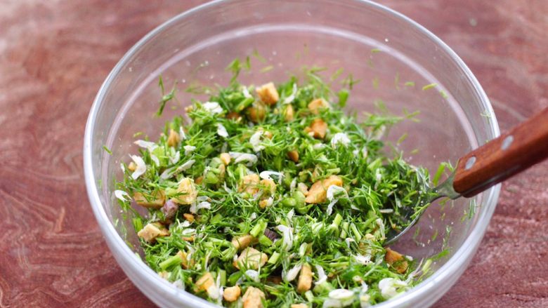 4. 取一个大一点的器皿,放入切碎的茴香葱花和猪油渣,再放入淡干虾皮。