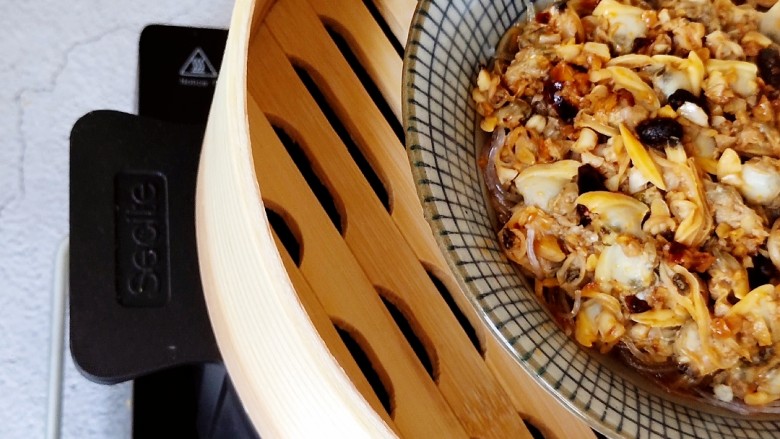 10. 这时候可以锅中加开水烧开,准备好蒸笼,把蒸碗放入,直接把花蛤肉铺在粉丝上即可。