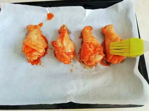 4. 烤盘铺上油纸,摆上鸡翅根,放入预热好的烤箱中层,200度烤十分钟。