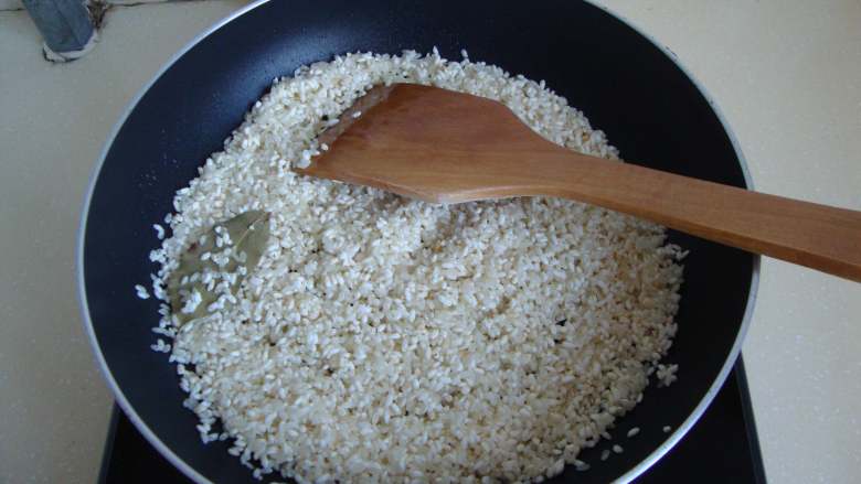 8. 橄榄油炒香大米和香叶,炒到大米变白微微膨胀