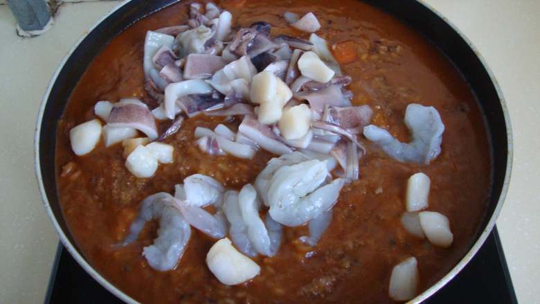 11. 放入扇贝柱、虾仁和鱿鱼煮熟