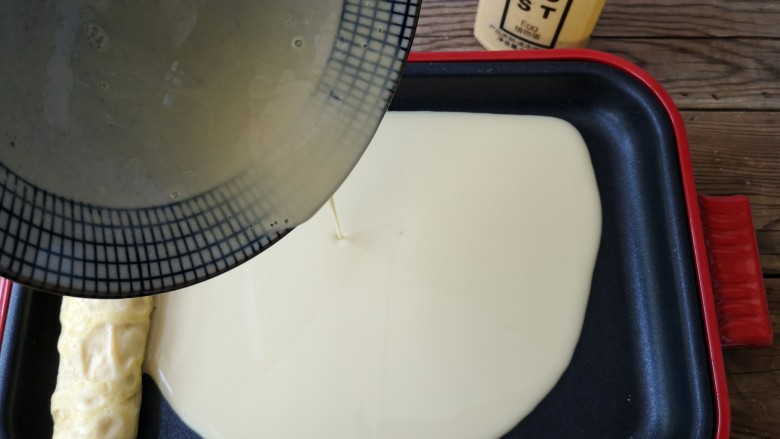7. 定型的蛋皮从一边开始卷起,尽量卷的紧凑一些。卷好的蛋皮放置在锅子另一边。