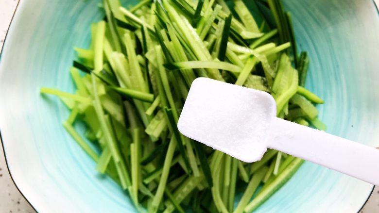 4. 水果黄瓜洗净,去不去皮随你个人喜好,然后切成丝,和莴笋放在一起
