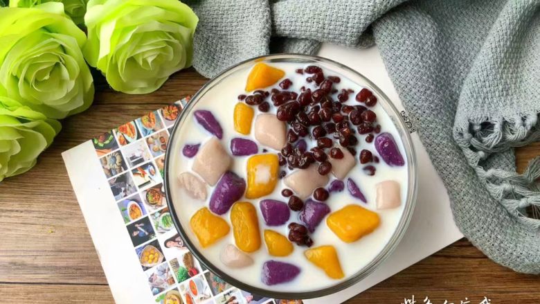 8. 芋圆过凉以后捞到碗里,加入煮好的牛奶,放上适量蜜红豆。