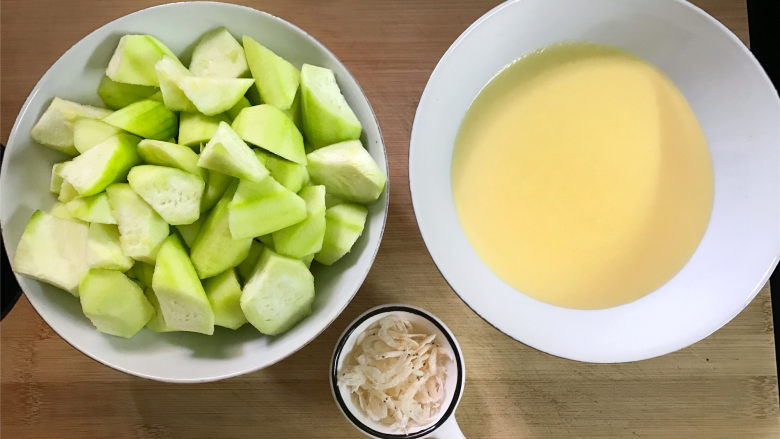 2. 鸡蛋加少许盐和料酒打散,丝瓜去皮后清洗干净,滚刀切块,虾皮洗净。