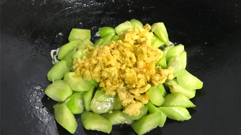 8. 和丝瓜虾皮一起翻炒匀后就可以熄火了。