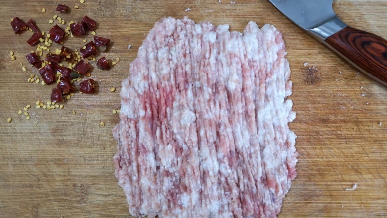 4. 热锅倒入适量油,油热后倒入猪五花肉糜,翻炒至变白,肥肉煸出油后盛出备用,锅底留底油。
