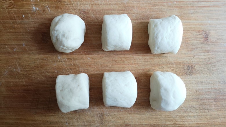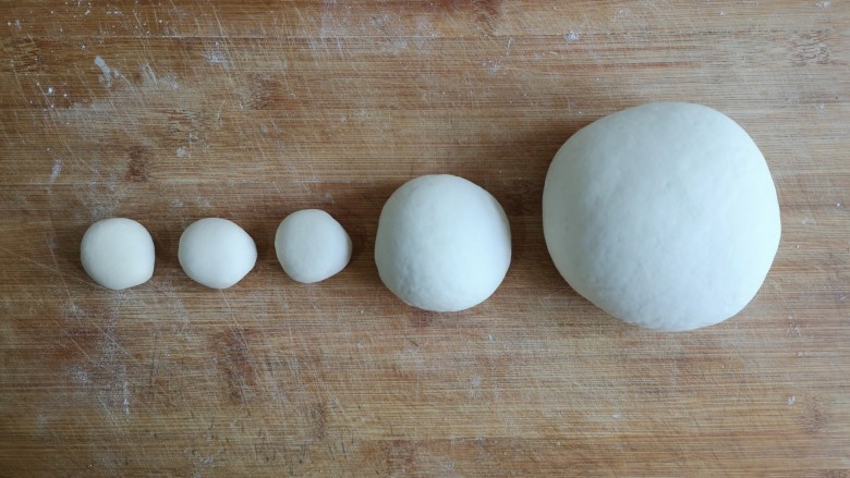12. 将面团按使用大小分成5块。最大的白色面团放一边盖好保鲜膜备用。