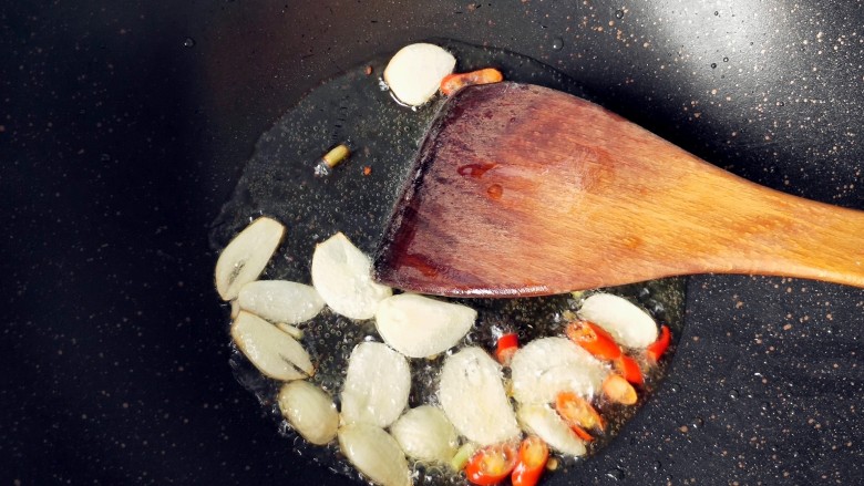 5. 锅内放油,放大蒜,小米椒爆香。
