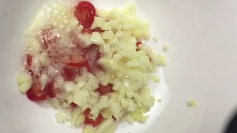 5. 碗中放入小米辣,蒜末,姜末,浇一勺热油