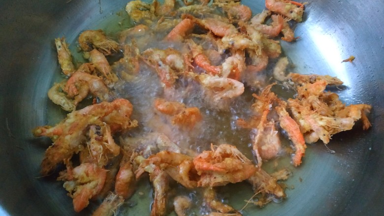7. 放入裹好面粉的河虾,炸至变色