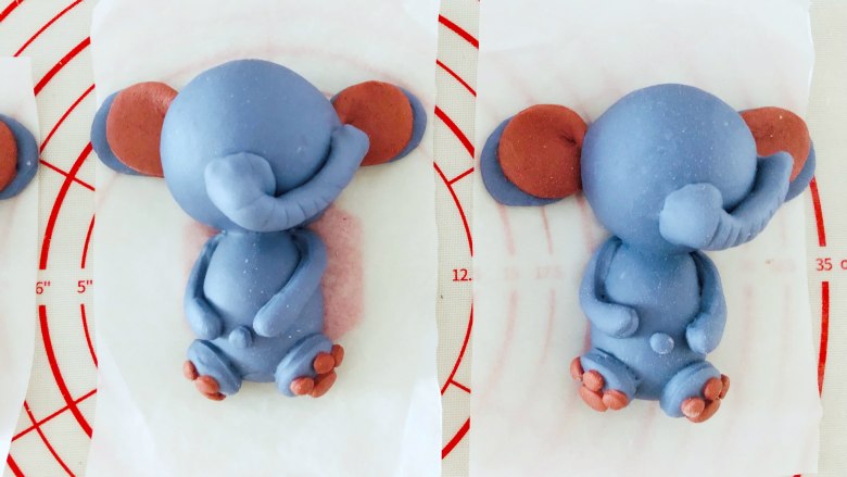 6. 然后制作出大象的耳朵和脚。两个不同颜色面团都做成水滴形,粉色面团的水滴形稍微少一些,蓝色大一些。
