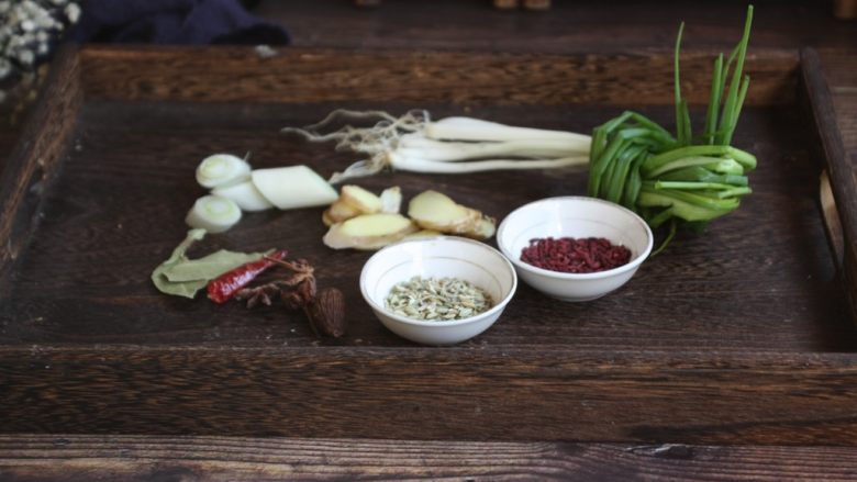 6. 锅烧热,放入2勺的油,油微热时放入小香葱、姜、草果、干辣椒,煸炒至出香味。