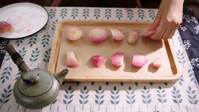 1. 半生桃洗净蒸熟去皮核,撒盐搅拌,阳光下腌制半小时;