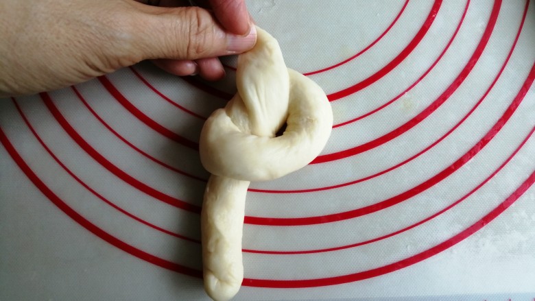 11. 把长的一端塞入结里面,捏紧两端,成为一个五环花形