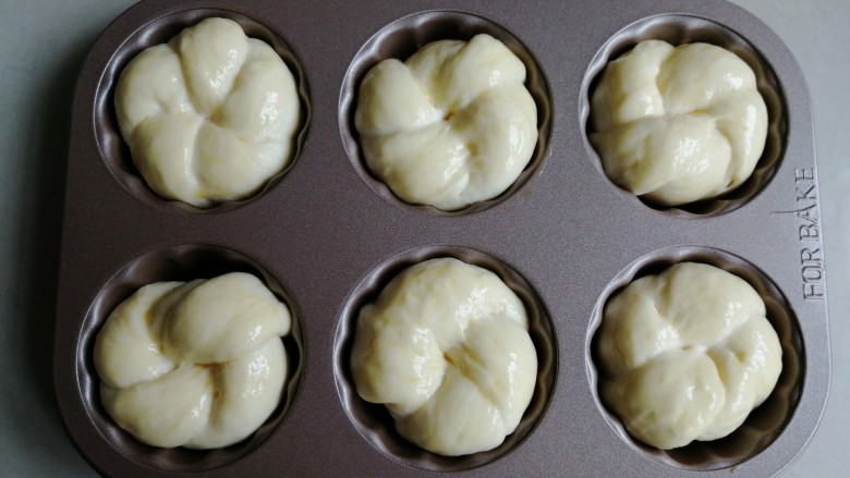12. 放入6连模里,这样烘烤出来的形状更好看,没有模具的话,直接放在烤盘上烘烤也可以的。放入烤箱内,再放置一碗温热水,使烤箱内部达到一定的湿度,用烤箱的发酵档,发酵至两倍大。没有发酵功能的烤箱,就通过勤换热水来达到合适的温度