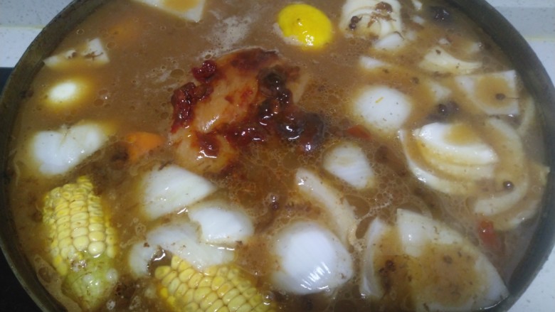 17. 大火煮开转小火煮3小时,每一个小时翻一下面。