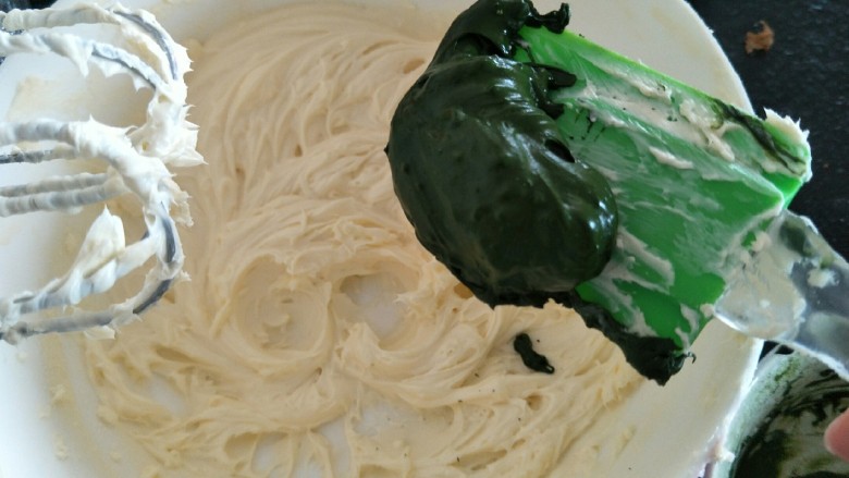 18. 把热牛奶(吉利丁)溶液,加入刚刚打好的抹茶奶油中。