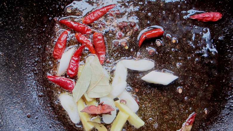 5. 锅留底油,爆香葱姜蒜、八角、干辣椒、花椒